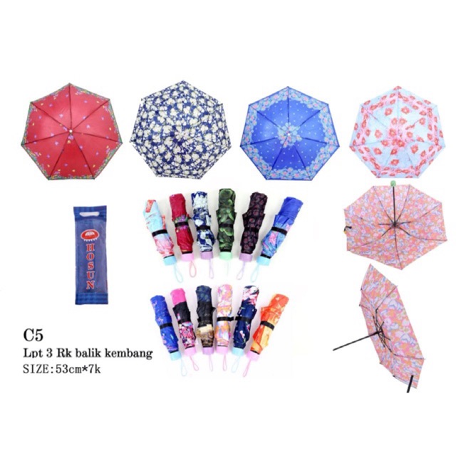 Payung Lipat 3 Edisi Kembang / Motif BungaPayung Lipat 3 ini Sangat Simple & Elegan karena bersifat warna yang FashionSangat cocok untuk segala kalangan-Anti-Gagang kokoh tidak mudah patah-Tombol tutup&buka payung yang sangat nyaman (tidak akan melukai tangan karena sdh ada pelindung lebih halus )-Sarung sesuai warna payung-Tiang besi anti karat-Fashionable & Simple Warna Random, Harap cantumkan keinginan warnanya ingin warna muda apa warna tua.Bahan : Polyester yang berkualitasRangka : Besi yang berkualitas lebih kokohPanjang = 25cm (Dilipat / Ditutup )Panjang = 53.5 cm (Dibuka)Diameter= 100cm (Dibuka)#payungmagic#payungmurah#payungbagus#payunglipat#payungpraktis#payungcantik#payungunik#payungdimensi#payunglucu#payunglipat3#payun