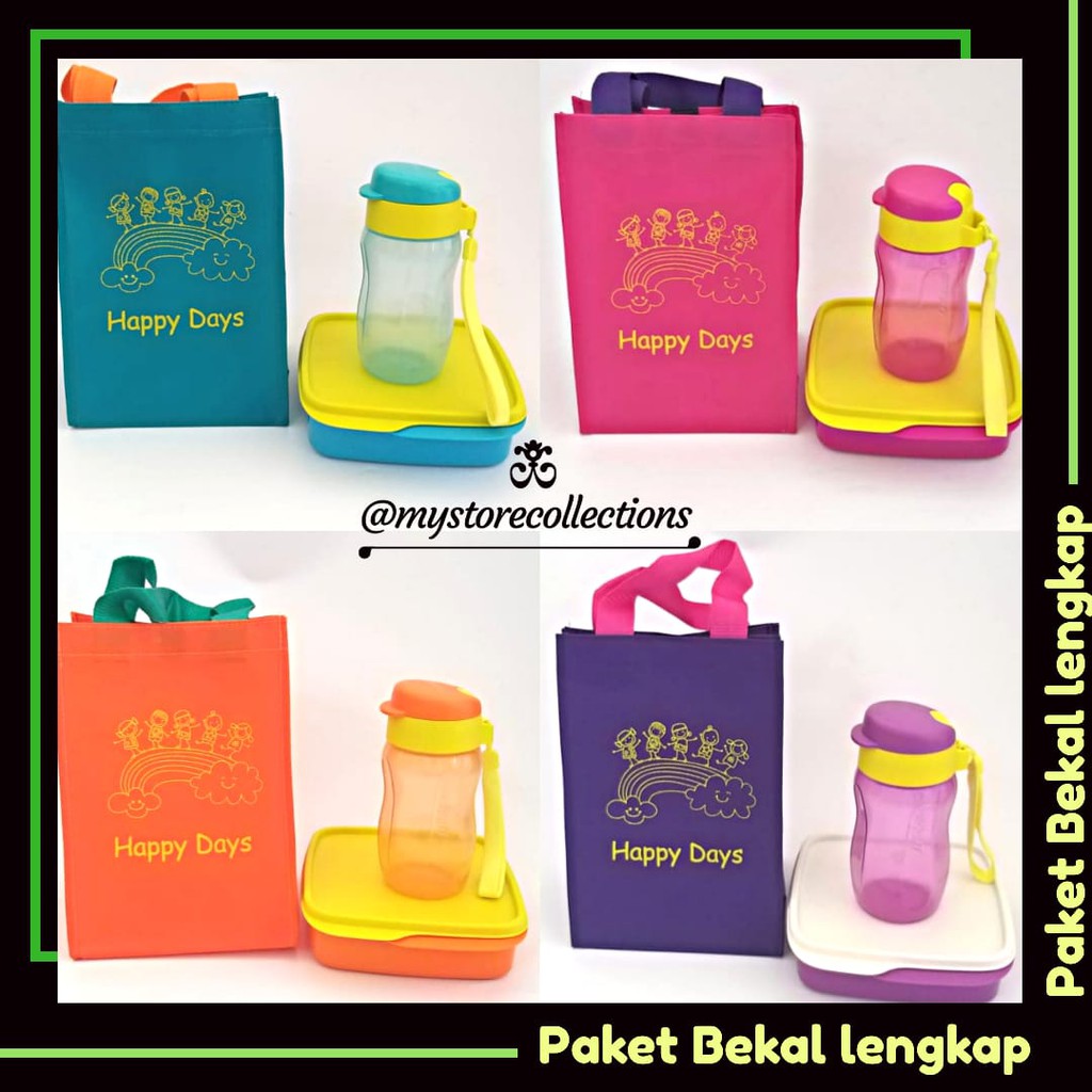 Paket Bekal Lengkap Set TupwrBag Happy Day (1 Pcs) Ukuran :P : 16 cm, T : 23 cm, L : 14,5 cmTAS serbaguna untuk kebutuhan bawa bekal makanan atau untuk keperluan lainnyaTas praktis untuk menempatkan semua perbekalan atau Tas Harian Lolly Tup (dengan Penyekat)Ukuran@ 550 ml // 16.7 cm x 15.7 cm x 5 cmSebagai ibu yang pintar, yuk ajarkan si Kecil untuk memulai kebiasaan sehat di sekolah atau aktivitas lainnya dengan membawa bekal sendiri untuk mengurangi jajan di kantin. Selain lebih sehat, membawa bekal sangat bermanfaat untuk kelestarian lingkungan. Ditambah dengan koleksi lunch box Lolly Tup yang berwarna warni dari Tupperware akan meningkatkan nafsu makan si Kecil.Mini Eco Bottle 310ml SatuanKegunaan:Botol minum imut untuk menemani aktivitas Anda dan keluargaUkuran:@ 310 ml / d : 6.8 cm, t : 14.7 cm Aktivitas padat bikin tubuh gampang capek? Coba siasati dengan penuhi cairan tubuh per hari agar menjaga tubuh tetap terhidrasi. Eco Bottle 310ml (1) hadir dengan desain imut dan ramping sehingga lebih nyaman untuk digenggam. Dengan varian warna yang berbeda, Anda dapat membawa aneka minuman lebih dari 1, Anda juga bisa memasukan buah-buahan saat membuat infused water. Eco Bottle 310ml (1) telah dilengkapi dengan strap jadi lebih praktis, karena Anda bisa membawanya kemanapun dengan digantungkan di tangan.NB: MOHON TANYAKAN KETERSEDIAAN BARANG TERLEBIH DA