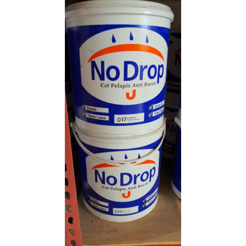 READY STOCK SEMUA WARNA LANGSUNG Order saja gan:PEMBELIAN BANYAK HARAP CEK STOK LEBIH DULUCANTUMKAN KODE DAN WARNA DI NOTES. Katalog warna bisa dilihat digambar/ slide kedua001 Transparan009 PUTIH010 Abu Abu Muda024 Gun Metal002 Abu Abu017 Kuning (Cream)011 MOCHA007 Merah006 Coklat025 Banana019 Papaya018 Apricot026 Apple021 Melon020 Kiwi029 Strawberry 030 Grape004 Biru 022 Biru cerah003 HitamNo Drop adalah cat pelapis anti bocor yang memiliki sifat elastis, kedap air serta sangat tahan cuaca sehingga sangat cocok untuk digunakan pada permukaan tembok, beton.KEGUNAAN DAN KEISTIMEWAANKedap airSangat tahan cuacaSangat elastisTahan lamaDekoratifLebih kuatSangat mudah digunakanDATA TEKNISPenampilan :semiglossWarna :lihat kartu warna dan transparanKekentalan (temp 30°C):200 - 300 Poise untuk warna130 - 140 ku untuk transparanBerat Jenis (temp 30°C):1.0 - 1.3 kg/ lt, tergantung warnaKadar Padat:40 - 65%Pengencer:Air bersihKetebalan Film Kering:minimal 250 micronWaktu KeringSentuh:30 menit, tergantung sirkulasi , suhu dan kelembaban udaraKeras:24 jamWaktu Pengecatan ulang:minimal 2 - 4 jamCara Aplikasi:kuas, roll, spray konvensional/ airlessDaya Sebar Teoritis:± 2 m2 / kg , tergantung porositas permukaanPERSIAPAN PERMUKAANPermukaan yang akan dicat harus kering, bersih bebas dari karat, debu, minyak dan kotoranBersihkan area yang berlumut dan berjamur CARA PENGGUNAANAduk dulu No Drop sampai rata sebelum digunakanUntuk permukaan tembok, beton, asbes, plasterAplikasikan 1 lapis No Drop yang diencerkan dengan air ± 20% sebagai cat dasarBiarkan kering sebelum mengulang lapisan berikutnyaUntuk lapisan kedua dan selanjutnya, aplikasikan No Drop tanpa pengencer sampai ketebalan minimal 250 micronUntuk memperbaiki retakan/ sambungan < 2mm.Aplikasikan 1 lapis No Drop yang diencerkan dengan air ± 10% sebagai cat dasarTempelkan No Drop Membrane untuk memperkuat sambungan, biarkan setengah keringAplikasikan No Drop tanpa peng