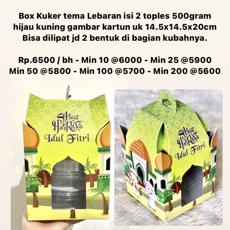 Box Kuker tema Lebaran isi 2 toples 500gram hijau kuning gambar kartun uk 14.5x14.5x20cmUkuran Toples max 14.5cm Bisa dilipat jd 2 bentuk di bagian kubahnya. Rp.6500 / bhMin 10 @6000Min 25 @5900Min 50 @5800Min 100 @5700Min 200 @5600Berat 80