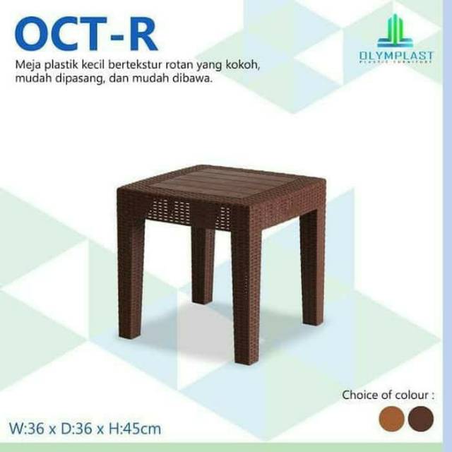 Meja teras plastik motif rotan Merk. : OlymplastBahan. : PlastikWarna. : Coklat muda dan tua Dimensi : 46 x 46 x 45 cm Dimensi kemasan : 46 x 46 x 9 cm Keunggulan Produk :1. Bahan full plastik sehingga tahan terhadap air2. Bagian atas meja sudah tersedia tempat untuk kaca3. Cocok untuk indoor dan ou