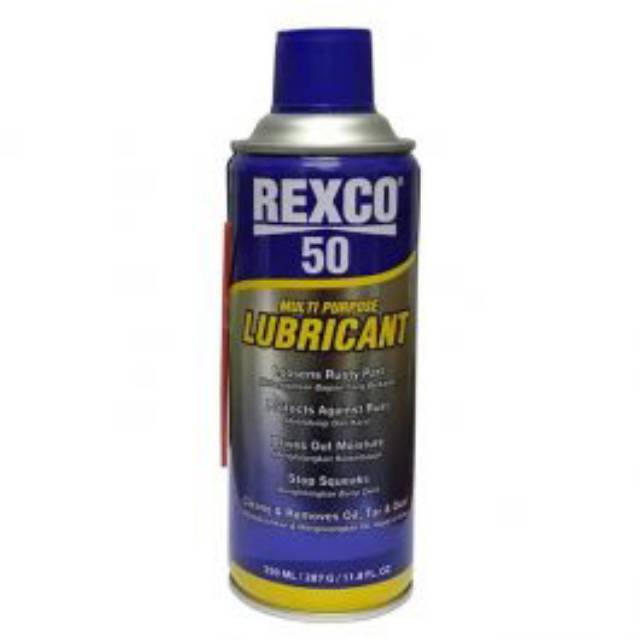REXCO 50 MULTI PURPOSE LUBRICANT adalah cairan multifungsi yang berfungsi untuk membersihkan, melumasi dan memproteksi mesin serta peralatan yang terbuat dari metal. Dengan penetrasi 2x lebih cepat, lubrikasi 3x lebih efektif, dan formula anti karat 3x lebih lama dari merk lain, rexco 50 sangat baik dalam melindungi metal dari karat dan korosi, melepaskan mur dan baut yang berkarat dengan kemampuan penetrasi yang cepat, menghilangkan bunyi derit akibat gesekan, dan dapat membersihkan kotoran oli, aspal, serta debu dari komponen barang anda. Cairan ini sangat efektif untuk digunakan pada mesin industri, engsel pintu, aki mobil, dan bagian dari body mobil ataupun motor.UKURAN : 350 MLFungsi : Rexco 50 Lubricant berfungsi untuk membersihkan, melumasi dan memproteksi mesin dan peralatan yang terbuat dari metal.Unique Selling Point : Dijamin Kualitas 3x lebih baik & Harga lebih murah.____________________________________________________________________________________________REXCO 50 MULTI PURPOSE LUBRICANT is a multifunctional liquid that can be used to clean, lubricate and protect machines and equipment made of metal. With 2x penetration faster, 3x lubrication is more effective, and anti-rust formula 3x longer than other brands, Rexco 50 is very good at protecting metals from rust and corrosion, releasing nuts and bolts that rust with fast penetration ability, eliminating creaking noise due friction, and can clean oil dirt, asphalt, and dust from the components of your goods. This liquid is very effective for use in industrial machinery, door hinges, car batteries, and parts of the car or motorcycle
